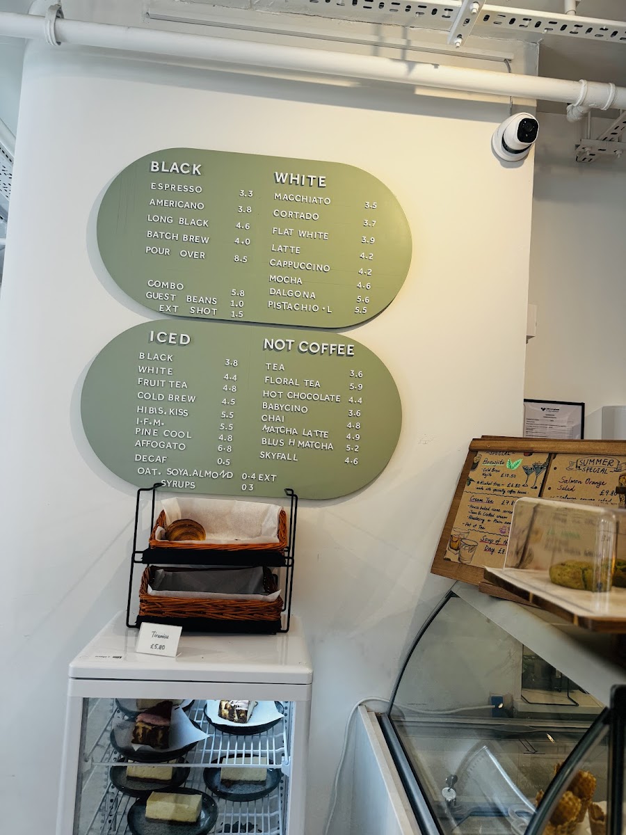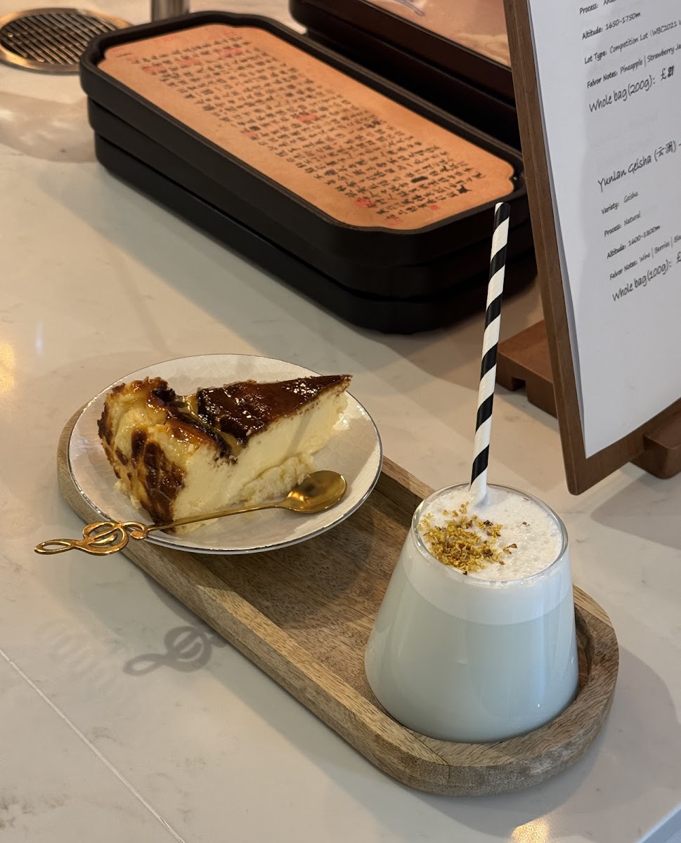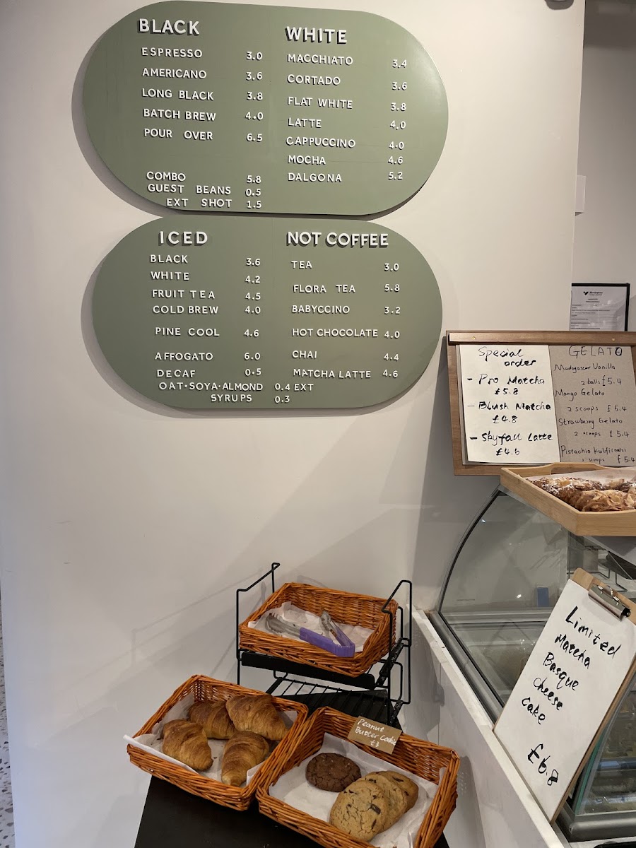 In addition to coffee, the menu offers gelato flavors like Strawberry Gelato and Pistachio Kulfic, providing a refreshing dessert option. Light food items include pastries such as croissants, along with cakes and tarts like Coffee and Walnut Cake and Tarte Tatin. Cold beverage options include Iced Coffee.